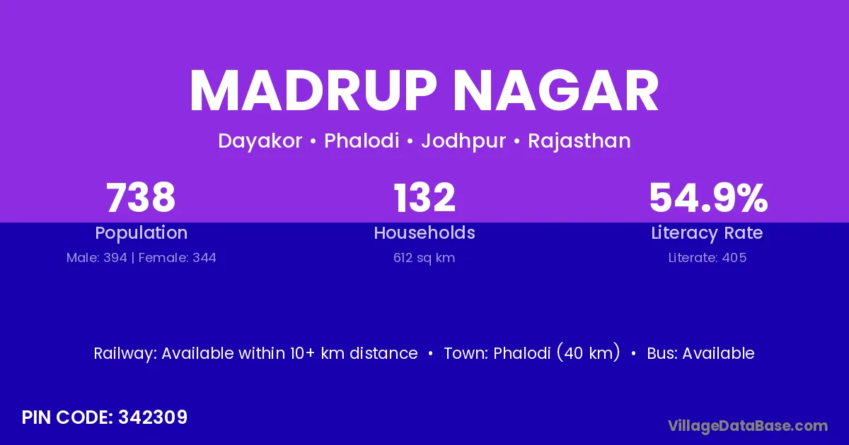 Phalodi (40 km) is the nearest town to Madrup Nagar village for major economic activities and is located approximately 40 km away.