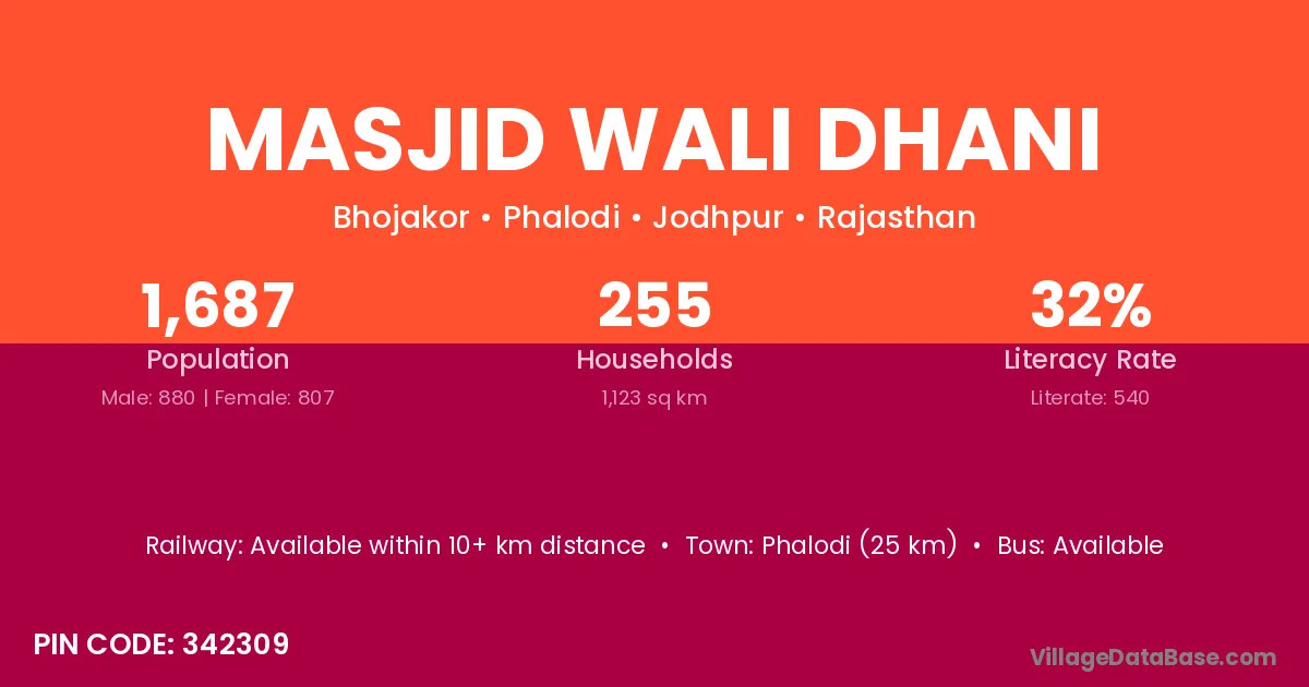 Phalodi (25 km) is the nearest town to Masjid Wali Dhani village for major economic activities and is located approximately 25 km away.