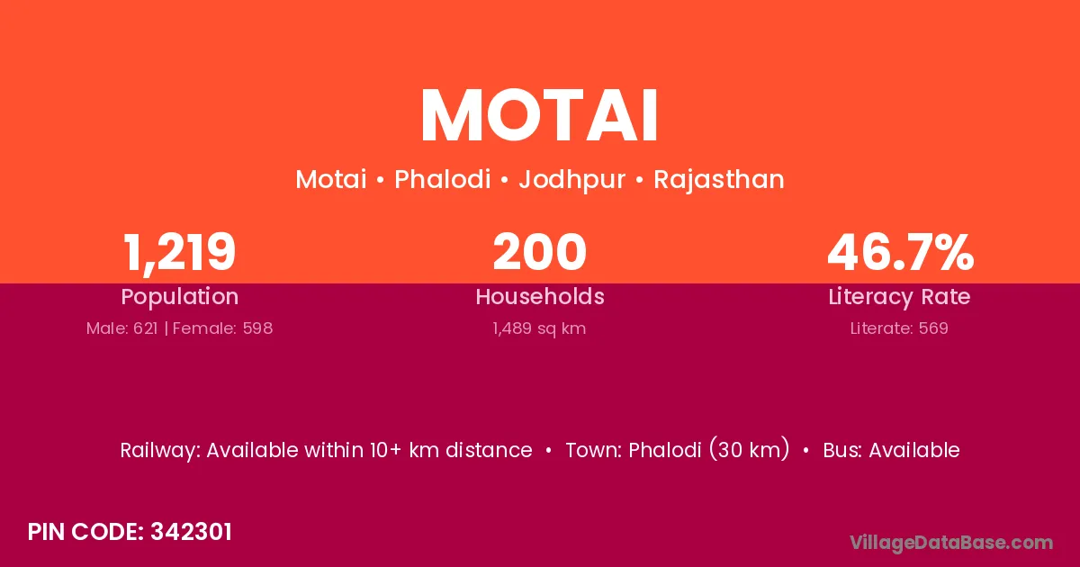 Phalodi (30 km) is the nearest town to Motai village for major economic activities and is located approximately 30 km away.