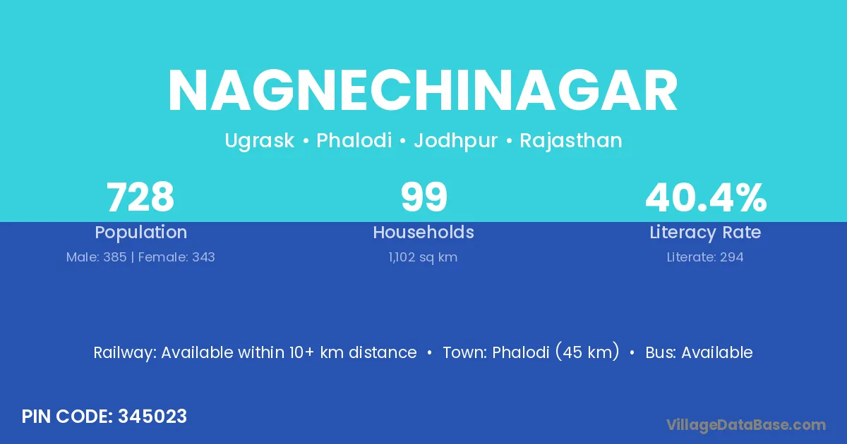 Phalodi (45 km) is the nearest town to Nagnechinagar village for major economic activities and is located approximately 45 km away.