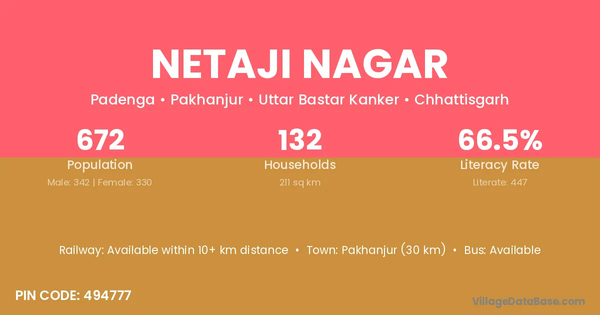 Netaji Nagar village has a total population of 483 people, of which 257 are males and 226 are females.