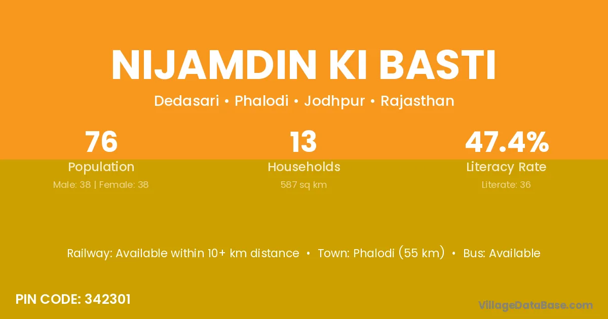 Phalodi (55 km) is the nearest town to Nijamdin Ki Basti village for major economic activities and is located approximately 55 km away.