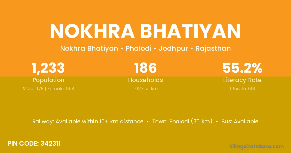 Phalodi (70 km) is the nearest town to Nokhra Bhatiyan village for major economic activities and is located approximately 70 km away.