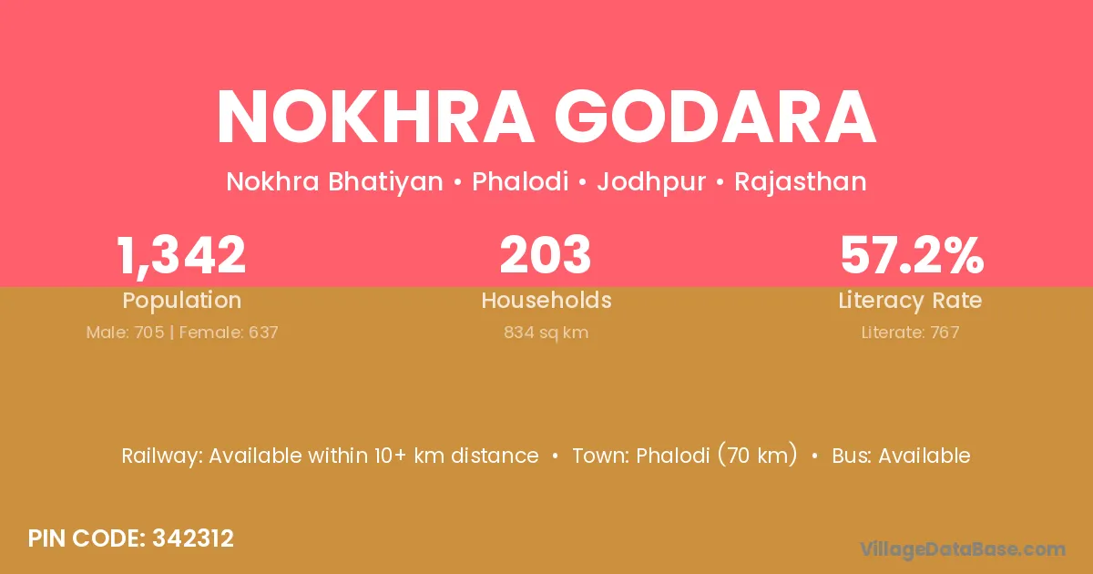 Phalodi (70 km) is the nearest town to Nokhra Godara village for major economic activities and is located approximately 70 km away.