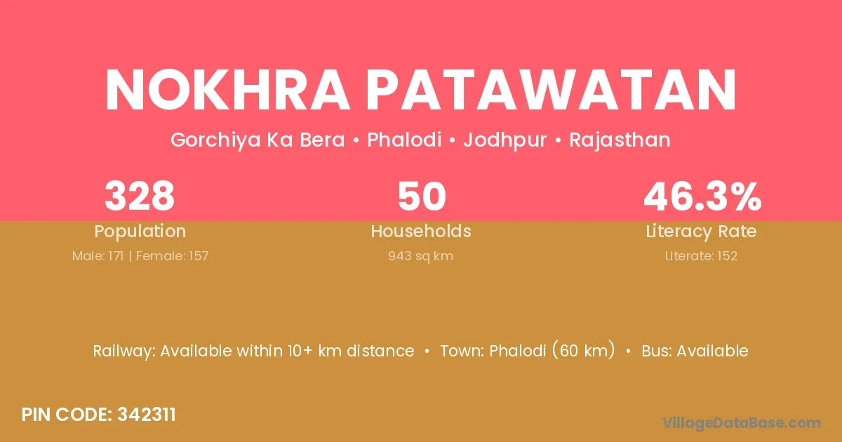 Phalodi (60 km) is the nearest town to Nokhra Patawatan village for major economic activities and is located approximately 60 km away.