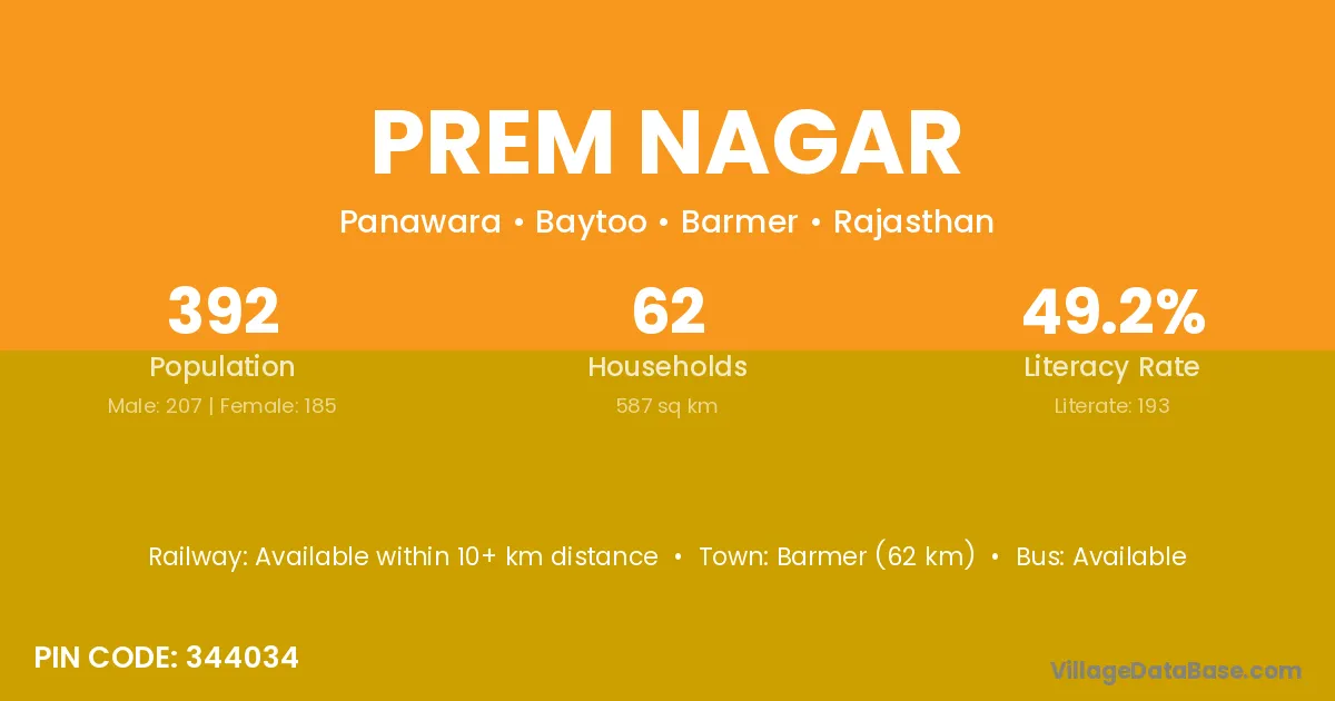 Phalodi (32 km) is the nearest town to Prem Nagar village for major economic activities and is located approximately 32 km away.