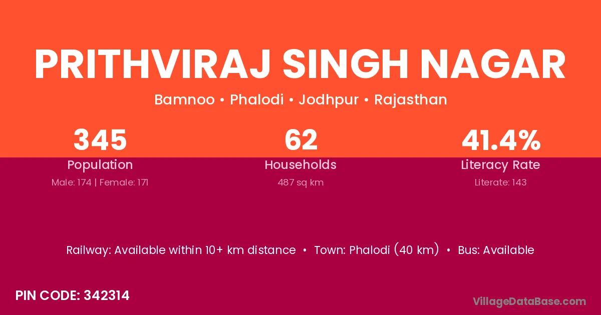 Phalodi (40 km) is the nearest town to Prithviraj Singh Nagar village for major economic activities and is located approximately 40 km away.