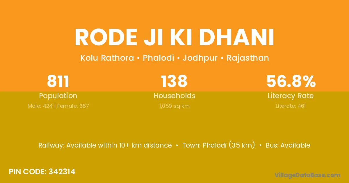 Phalodi (35 km) is the nearest town to Rode Ji Ki Dhani village for major economic activities and is located approximately 35 km away.