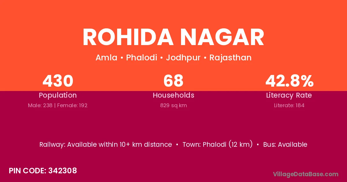 Phalodi (12 km) is the nearest town to Rohida Nagar village for major economic activities and is located approximately 12 km away.