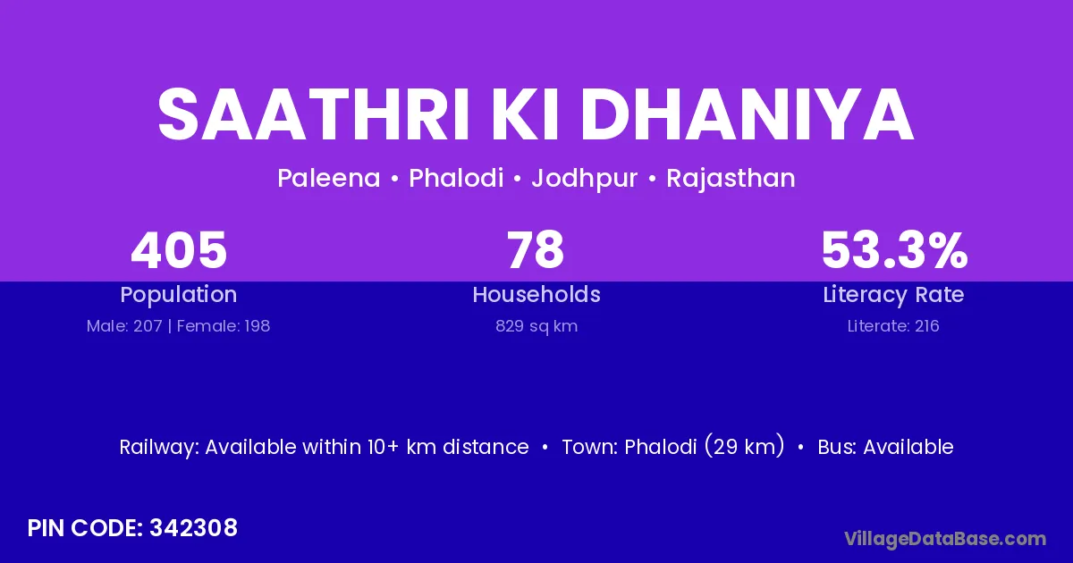 Saathri Ki Dhaniya village has a total population of 405 people, of which 207 are males and 198 are females.