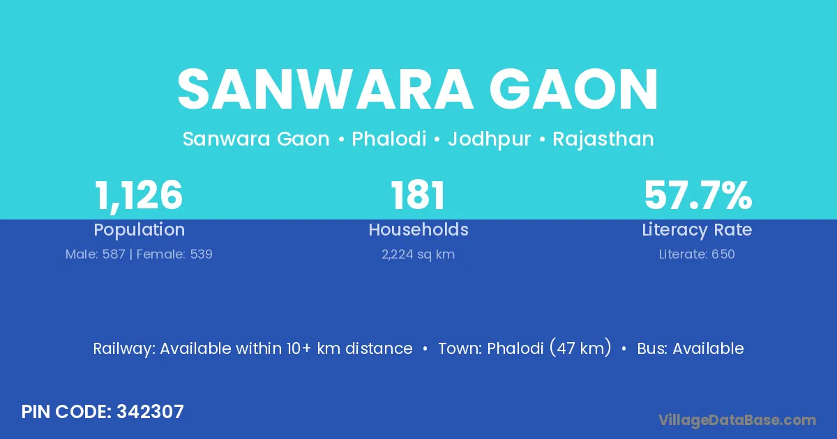 Phalodi (47 km) is the nearest town to Sanwara Gaon village for major economic activities and is located approximately 47 km away.