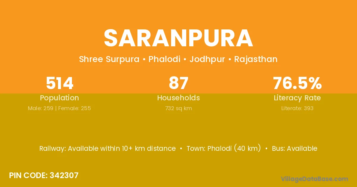 Phalodi (40 km) is the nearest town to Saranpura village for major economic activities and is located approximately 40 km away.
