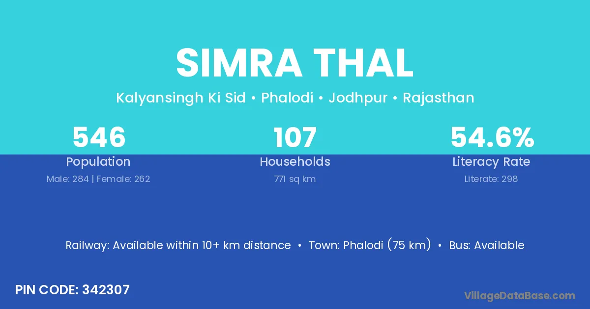 Phalodi (75 km) is the nearest town to Simra Thal village for major economic activities and is located approximately 75 km away.