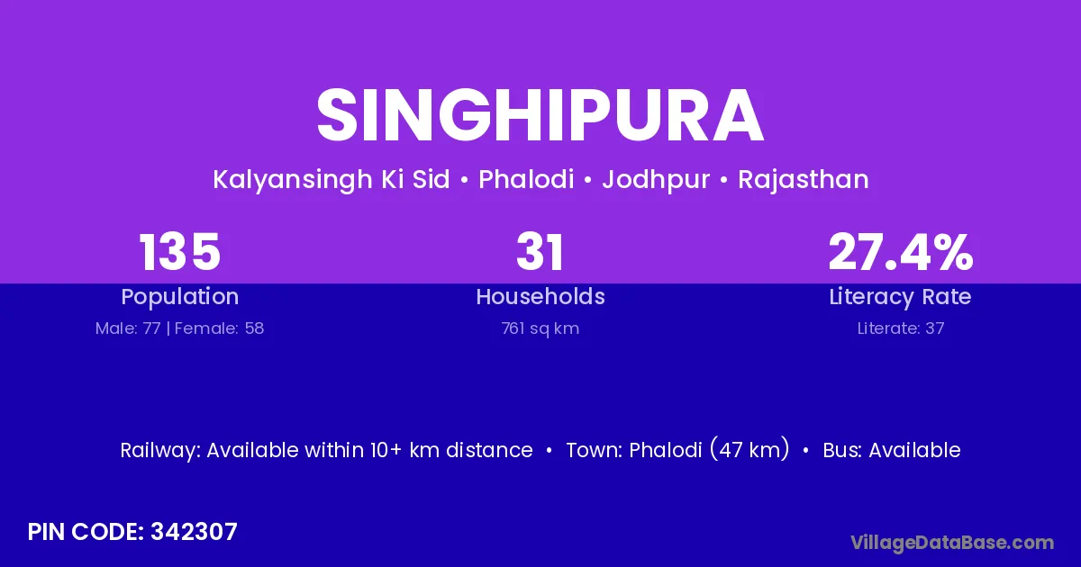 Phalodi (47 km) is the nearest town to Singhipura village for major economic activities and is located approximately 47 km away.