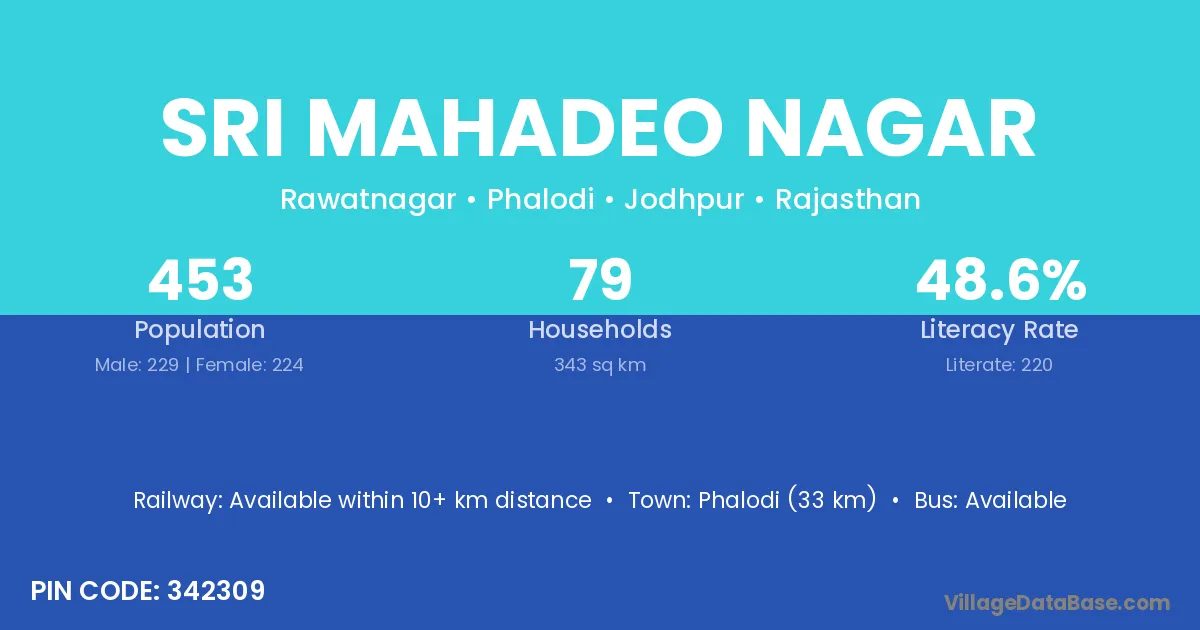 Phalodi (33 km) is the nearest town to Sri Mahadeo Nagar village for major economic activities and is located approximately 33 km away.