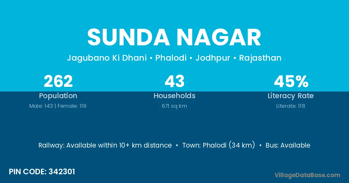 Phalodi (34 km) is the nearest town to Sunda Nagar village for major economic activities and is located approximately 34 km away.