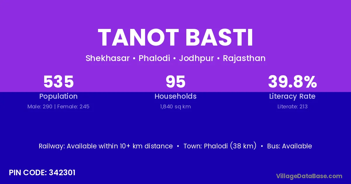 Phalodi (38 km) is the nearest town to Tanot Basti village for major economic activities and is located approximately 38 km away.
