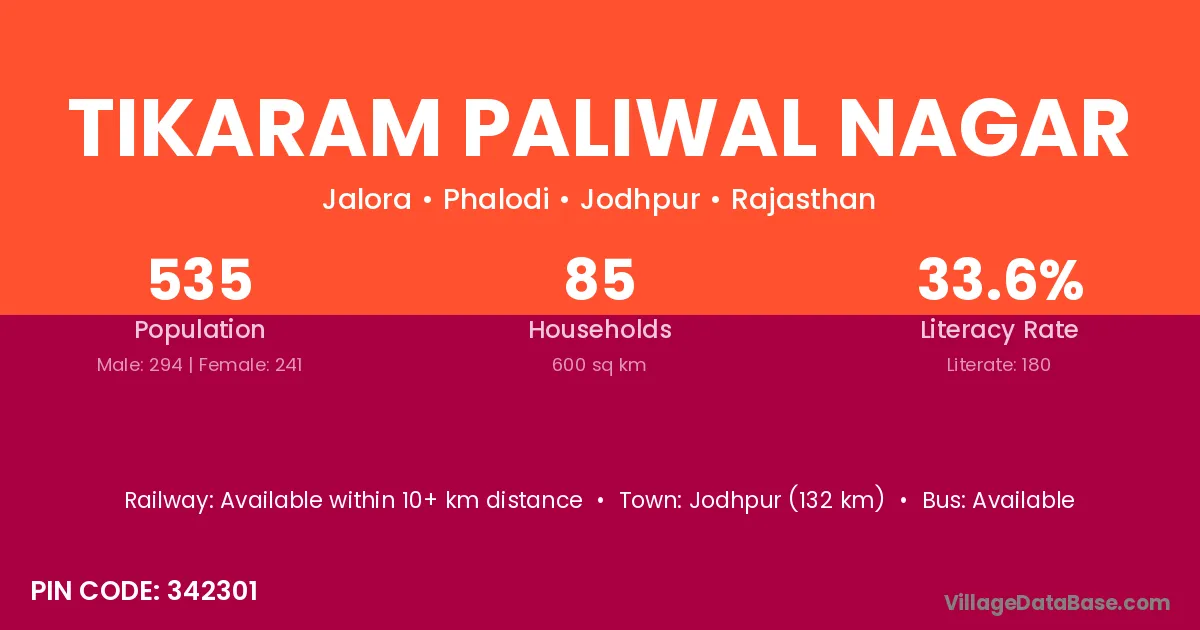 Jodhpur (132 km) is the nearest town to Tikaram Paliwal Nagar village for major economic activities and is located approximately 132 km away.