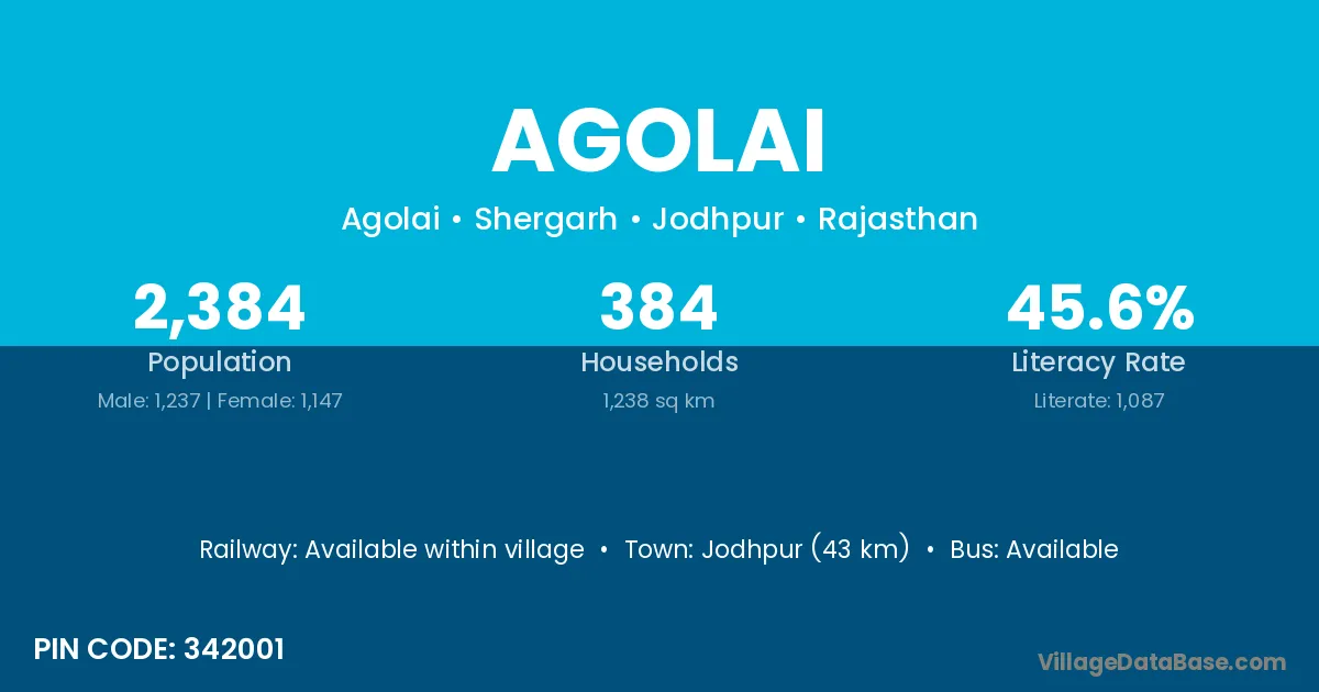Jodhpur (43 km) is the nearest town to Agolai village for major economic activities and is located approximately 43 km away.