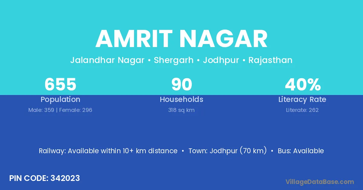 Jodhpur (70 km) is the nearest town to Amrit Nagar village for major economic activities and is located approximately 70 km away.