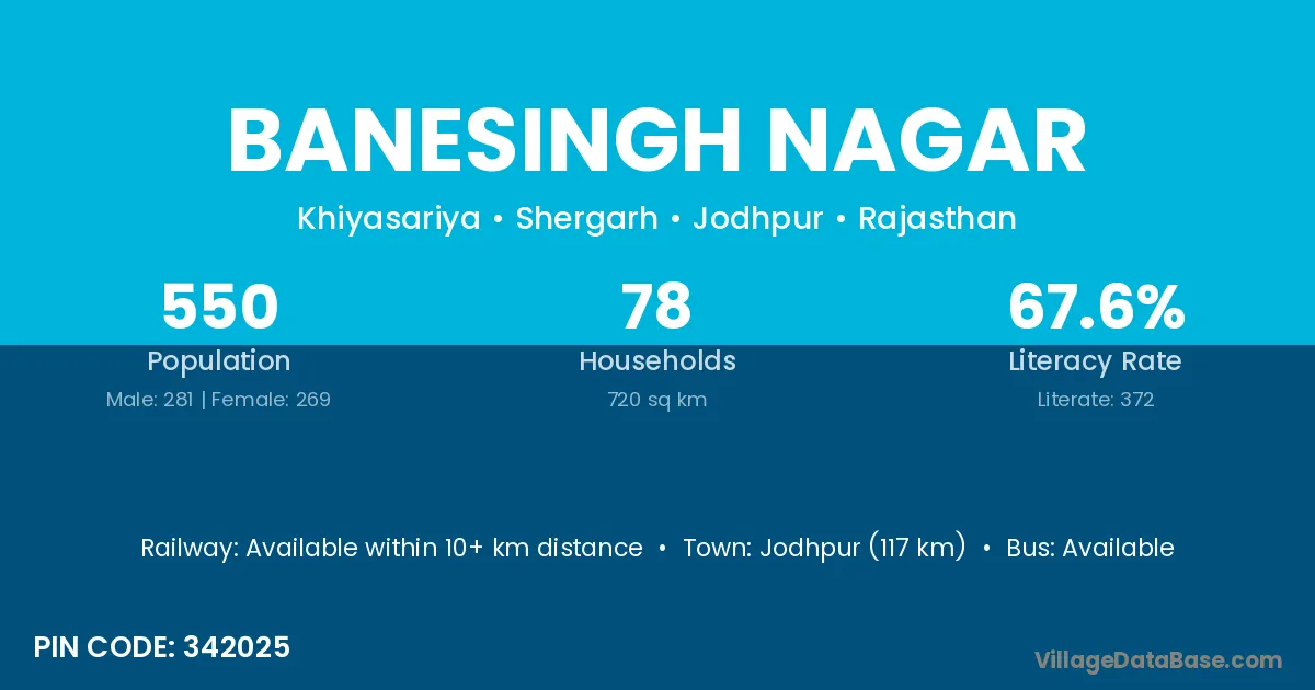 Jodhpur (117 km) is the nearest town to Banesingh Nagar village for major economic activities and is located approximately 117 km away.