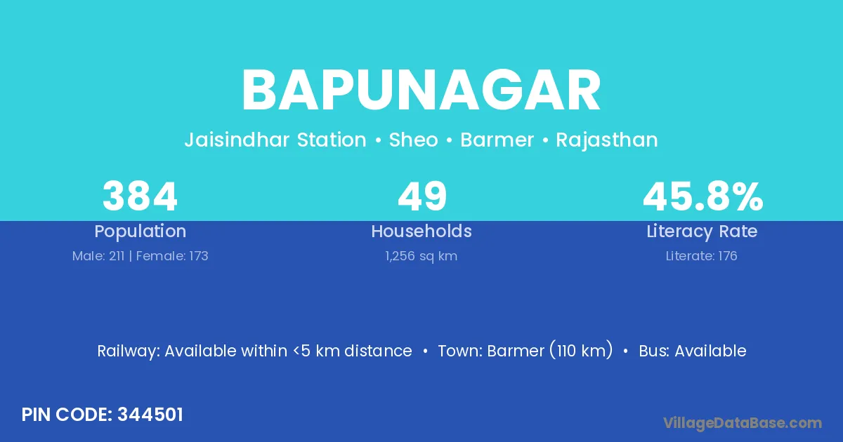 Jodhpur (110 km) is the nearest town to Bapunagar village for major economic activities and is located approximately 110 km away.