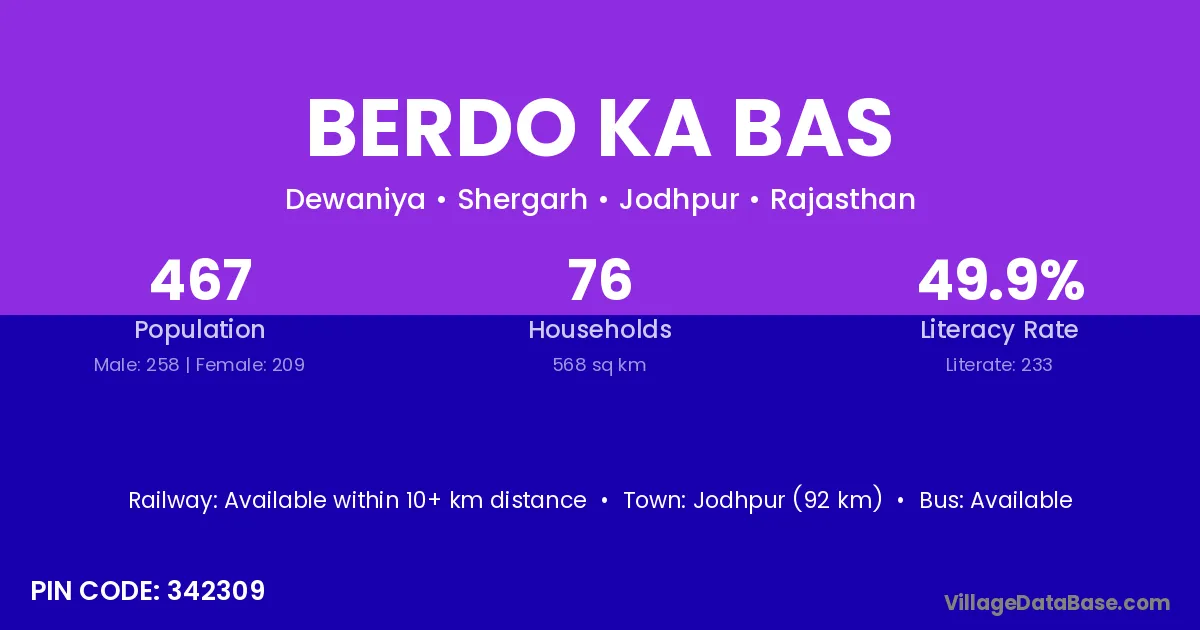 Jodhpur (92 km) is the nearest town to Berdo Ka Bas village for major economic activities and is located approximately 92 km away.