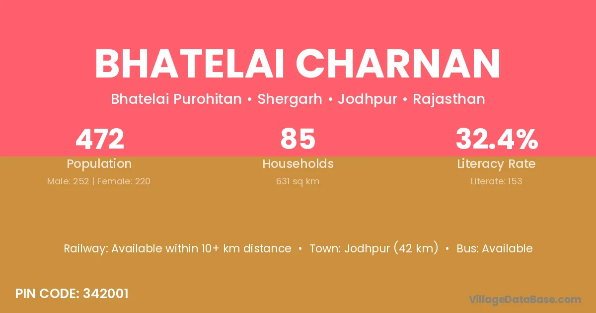 Jodhpur (42 km) is the nearest town to Bhatelai Charnan village for major economic activities and is located approximately 42 km away.