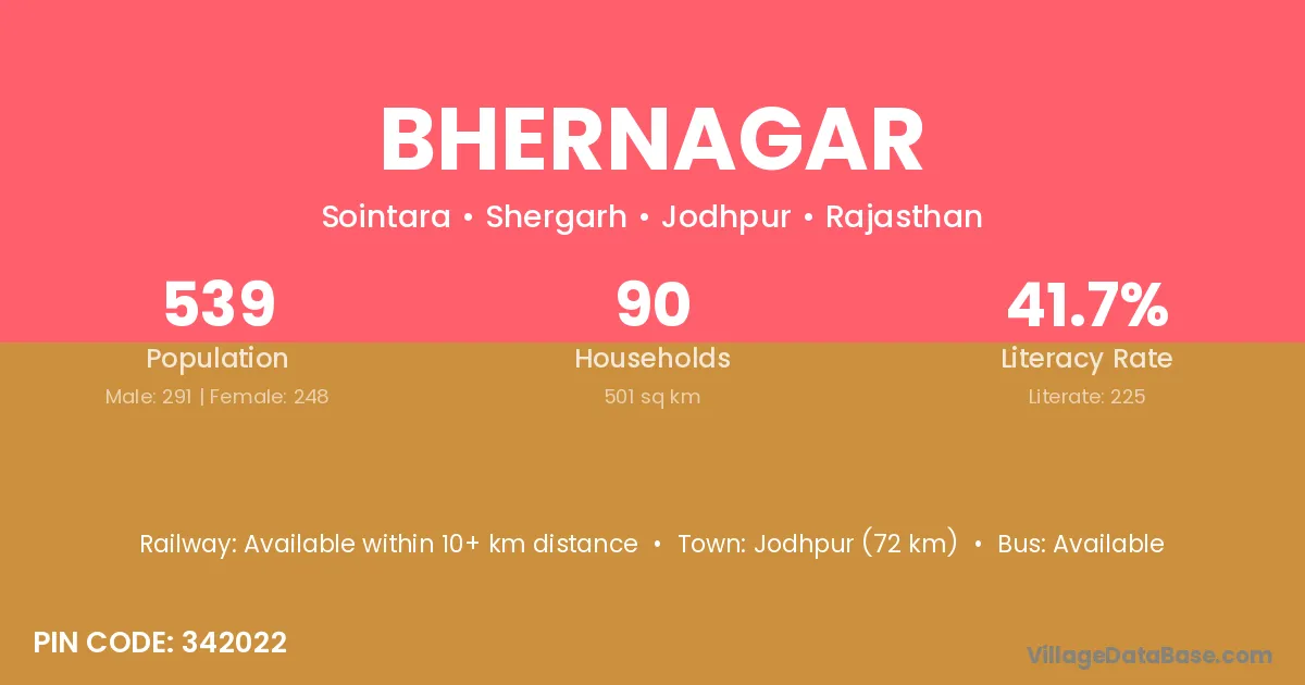 Jodhpur (72 km) is the nearest town to Bhernagar village for major economic activities and is located approximately 72 km away.