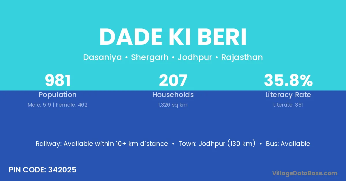 Jodhpur (130 km) is the nearest town to Dade Ki Beri village for major economic activities and is located approximately 130 km away.