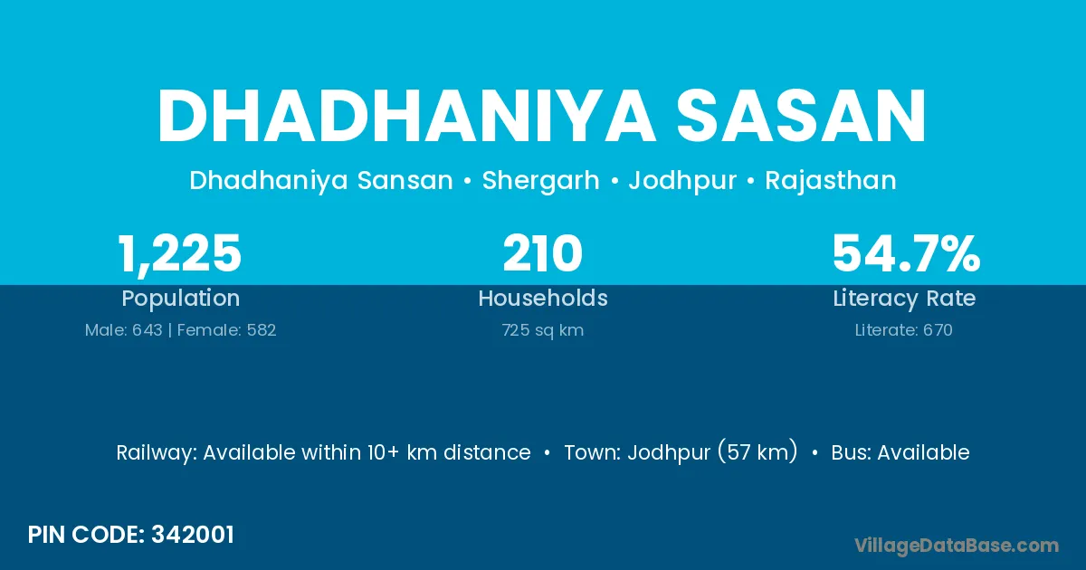 Jodhpur (57 km) is the nearest town to Dhadhaniya Sasan village for major economic activities and is located approximately 57 km away.