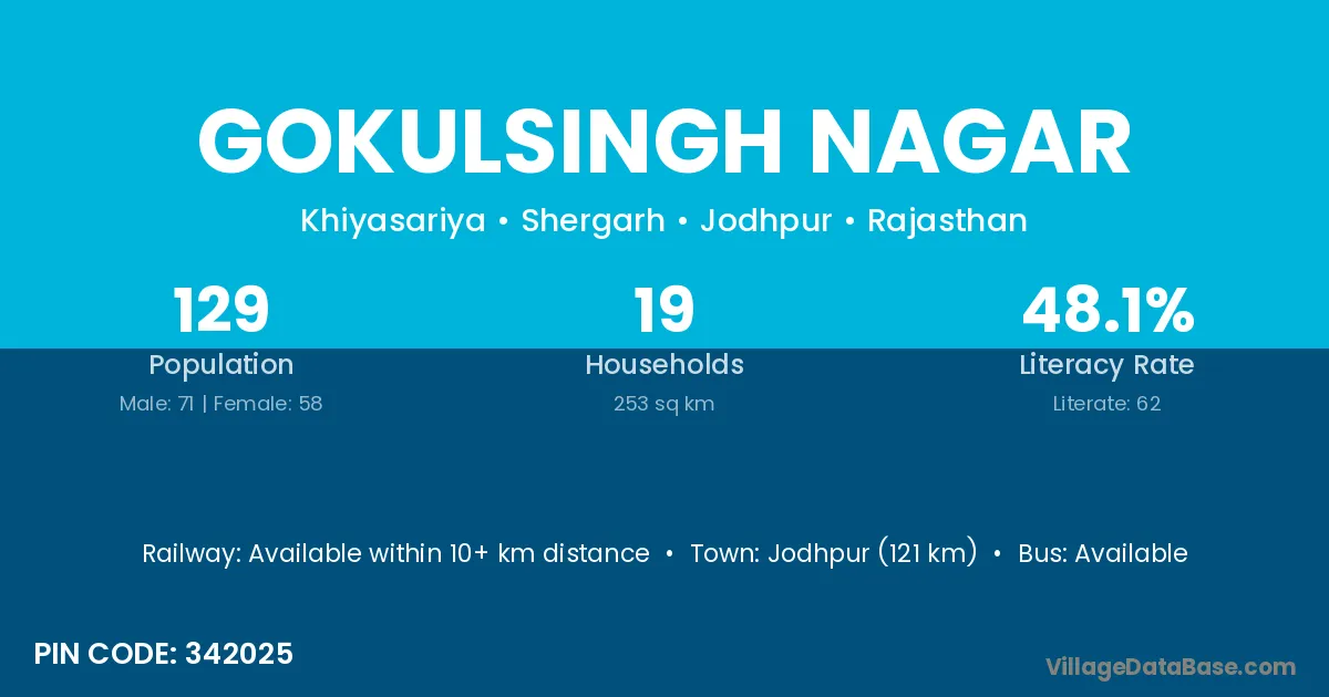 Jodhpur (121 km) is the nearest town to Gokulsingh Nagar village for major economic activities and is located approximately 121 km away.
