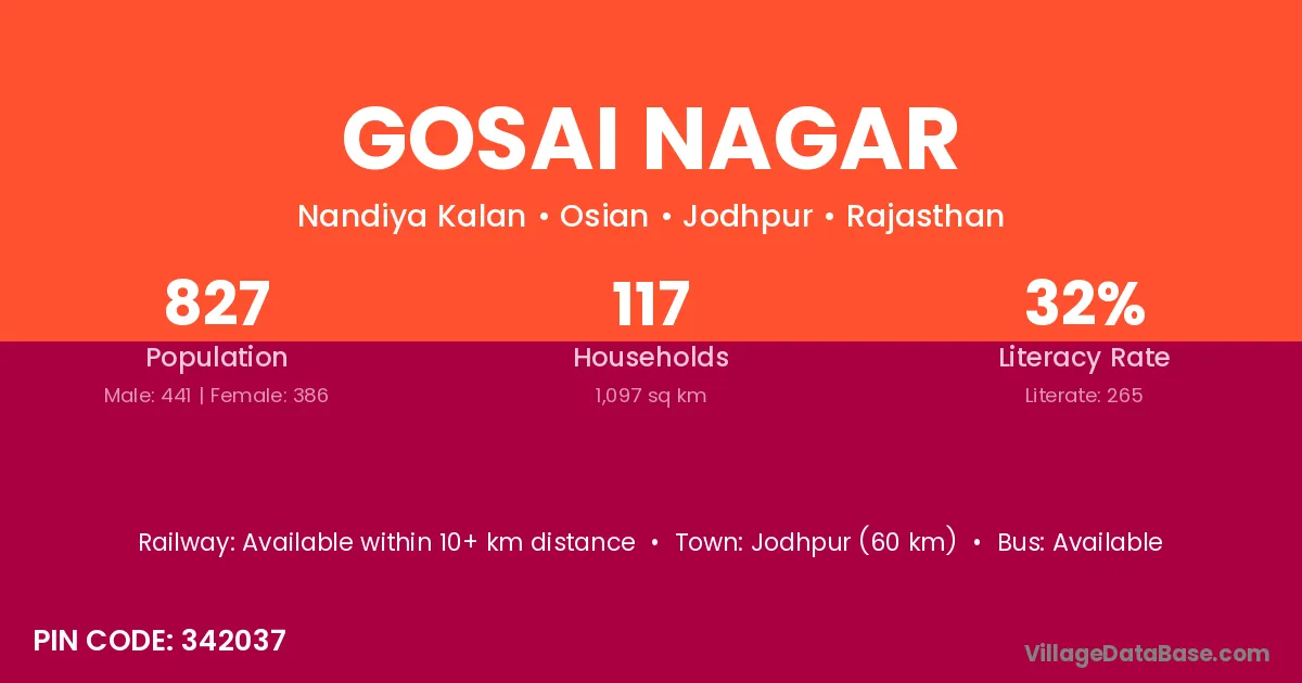 Jodhpur (125 km) is the nearest town to Gosai Nagar village for major economic activities and is located approximately 125 km away.