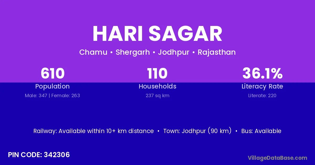 Jodhpur (90 km) is the nearest town to Hari Sagar village for major economic activities and is located approximately 90 km away.