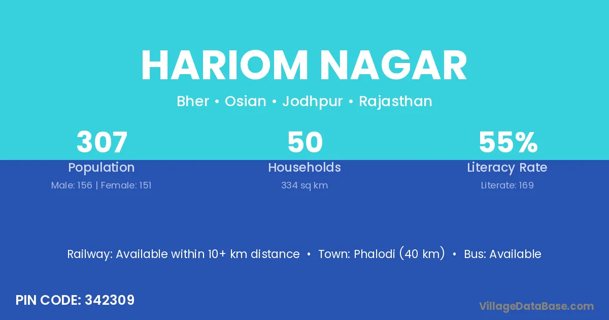 Jodhpur (80 km) is the nearest town to Hariom Nagar village for major economic activities and is located approximately 80 km away.
