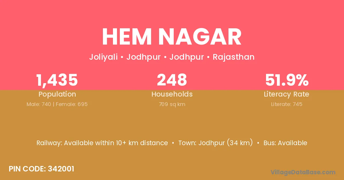 Jodhpur (140 km) is the nearest town to Hem Nagar village for major economic activities and is located approximately 140 km away.