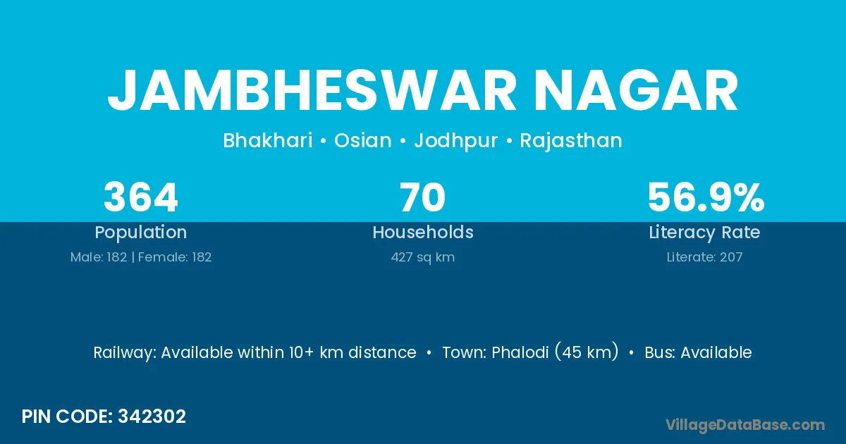 Jodhpur (108 km) is the nearest town to Jambheswar Nagar village for major economic activities and is located approximately 108 km away.