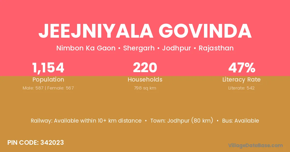 Jodhpur (80 km) is the nearest town to Jeejniyala Govinda village for major economic activities and is located approximately 80 km away.