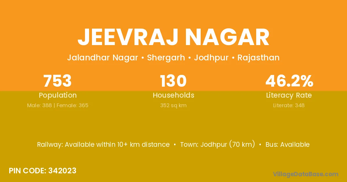 Jodhpur (70 km) is the nearest town to Jeevraj Nagar village for major economic activities and is located approximately 70 km away.