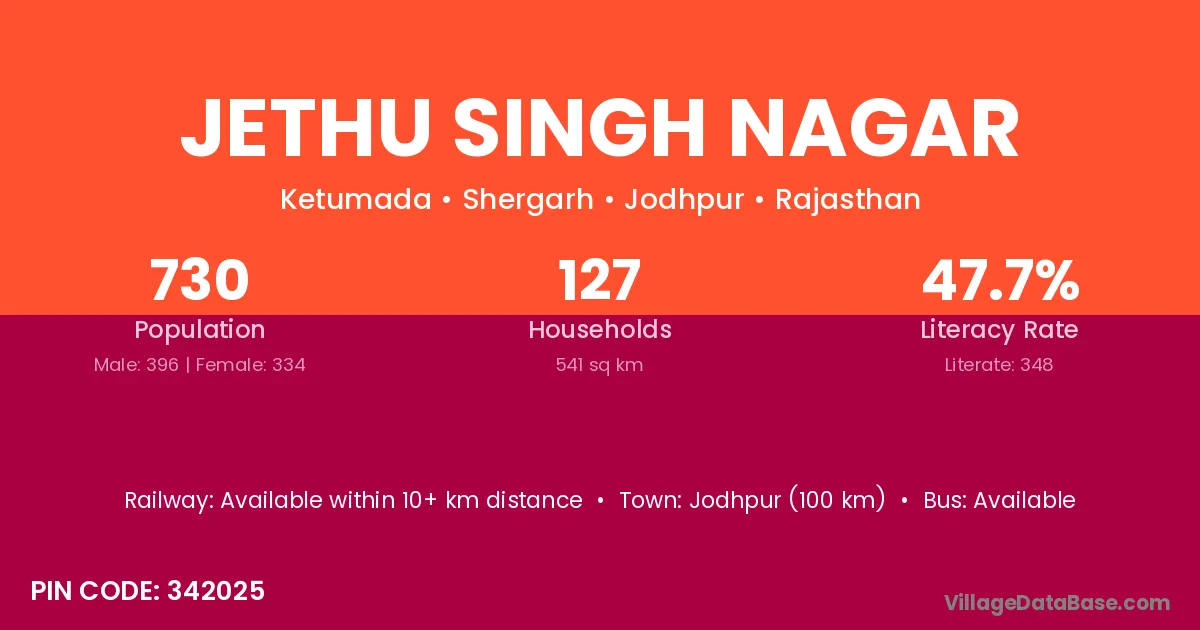 Jodhpur (100 km) is the nearest town to Jethu Singh Nagar village for major economic activities and is located approximately 100 km away.