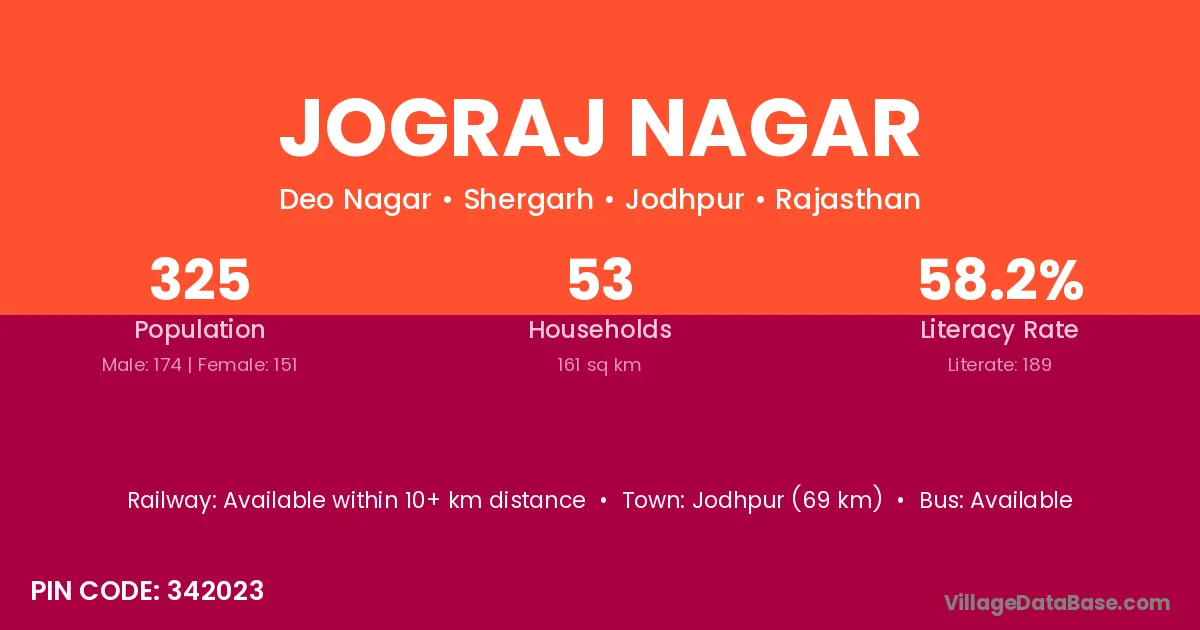 Jodhpur (69 km) is the nearest town to Jograj Nagar village for major economic activities and is located approximately 69 km away.