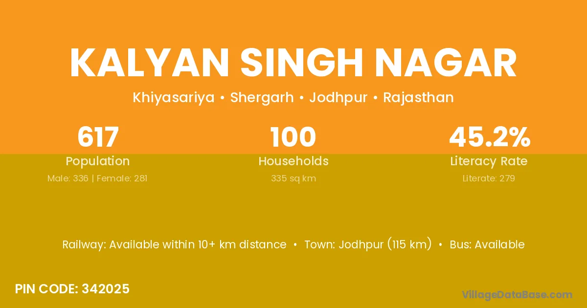 Jodhpur (115 km) is the nearest town to Kalyan Singh Nagar village for major economic activities and is located approximately 115 km away.