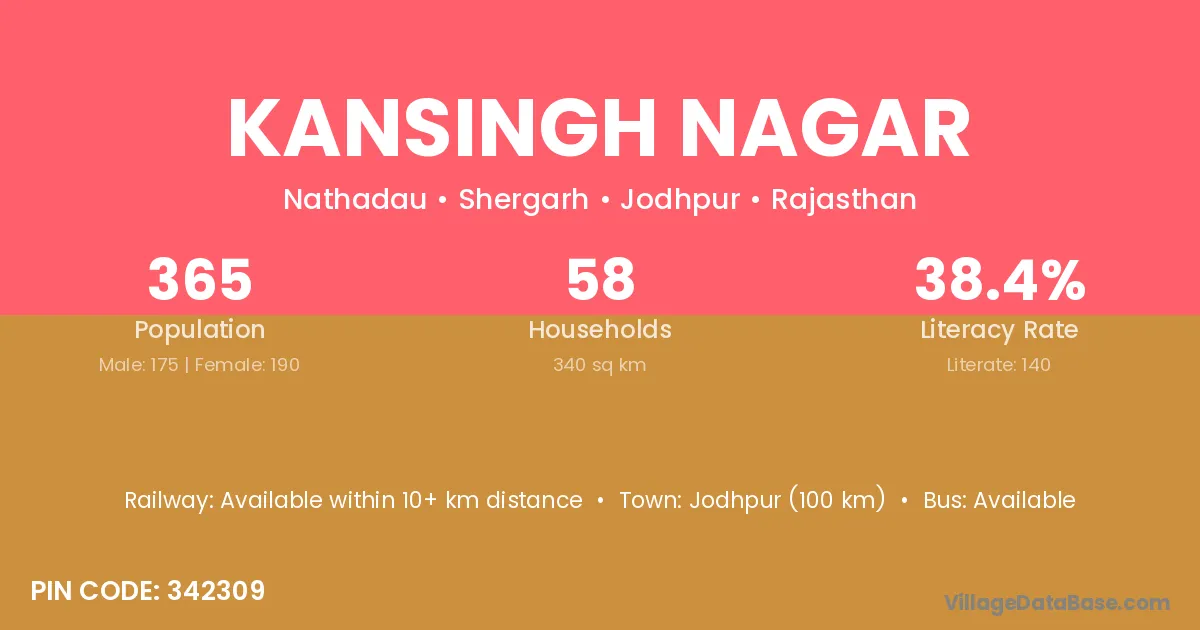 Jodhpur (100 km) is the nearest town to Kansingh Nagar village for major economic activities and is located approximately 100 km away.