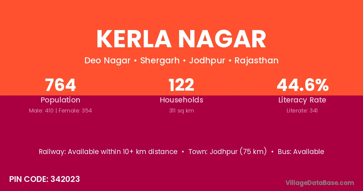 Jodhpur (75 km) is the nearest town to Kerla Nagar village for major economic activities and is located approximately 75 km away.