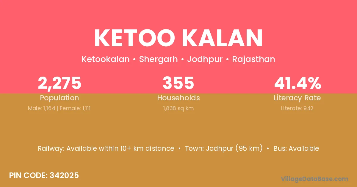 Jodhpur (95 km) is the nearest town to Ketoo Kalan village for major economic activities and is located approximately 95 km away.