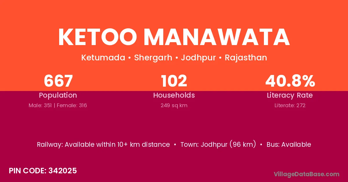 Jodhpur (96 km) is the nearest town to Ketoo Manawata village for major economic activities and is located approximately 96 km away.