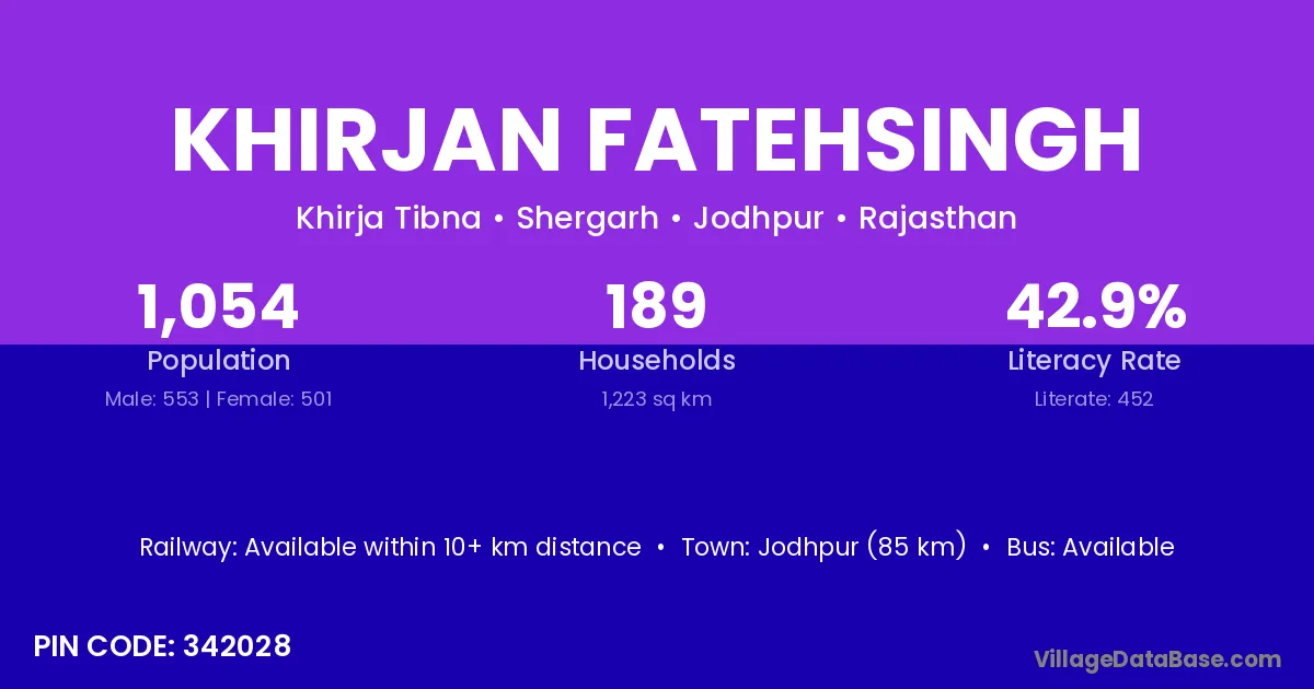 Jodhpur (85 km) is the nearest town to Khirjan Fatehsingh village for major economic activities and is located approximately 85 km away.