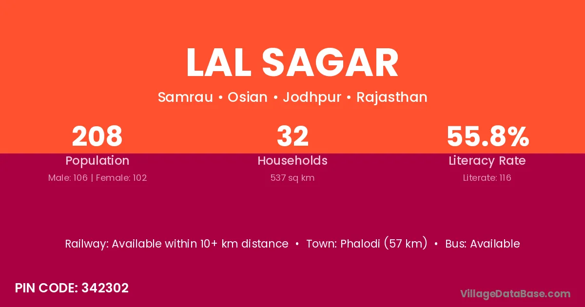 Jodhpur (111 km) is the nearest town to Lal Sagar village for major economic activities and is located approximately 111 km away.