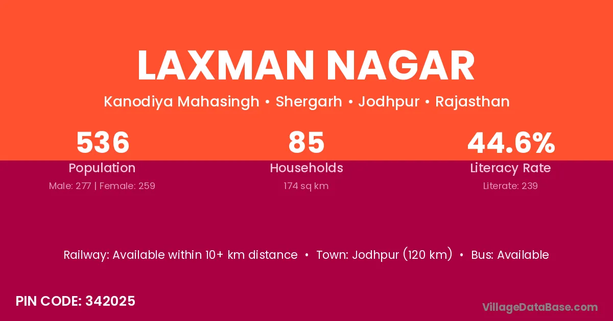Jodhpur (120 km) is the nearest town to Laxman Nagar village for major economic activities and is located approximately 120 km away.