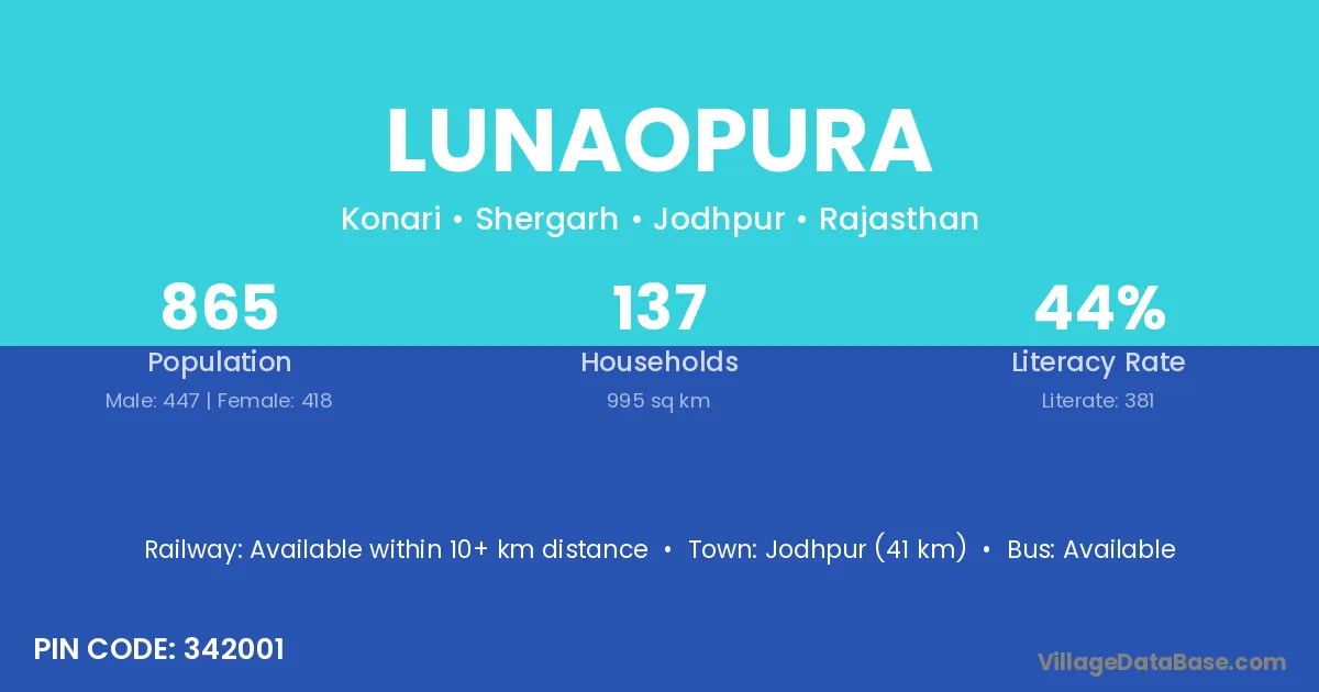 Jodhpur (41 km) is the nearest town to Lunaopura village for major economic activities and is located approximately 41 km away.